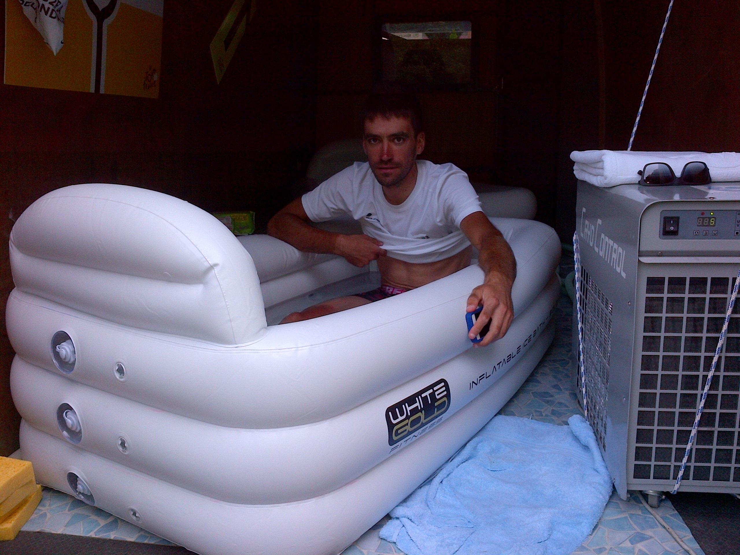 Eric Bouvat, responsable médical de l’équipe AG2R LA MONDIALE : «Après avoir essayé différents moyens de récupération par le froid, notamment la cryothérapie en corps entier, nous avons choisi les bains froids. Les bains sont dans une camionnette qui passe d’hôtel en hôtel.